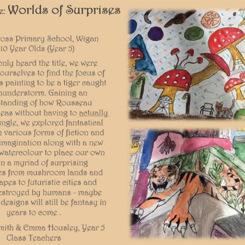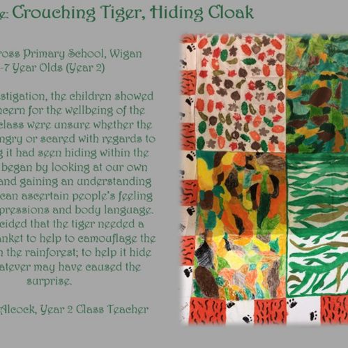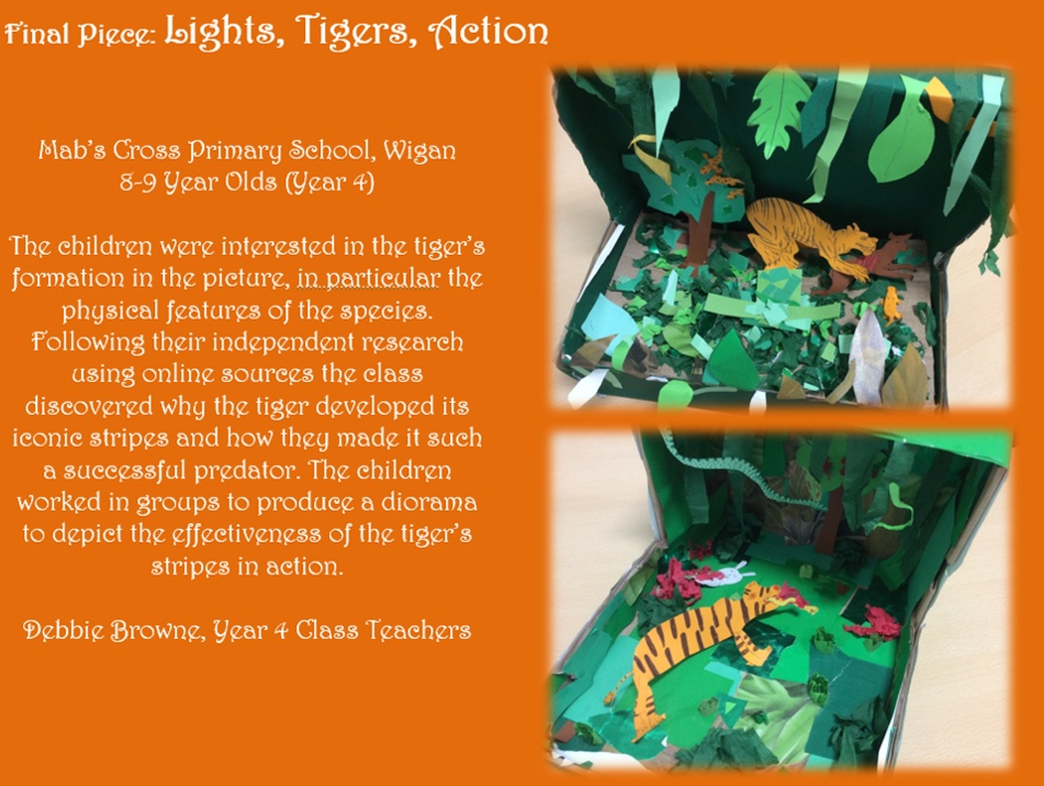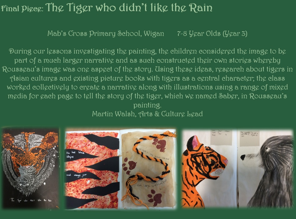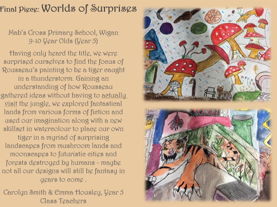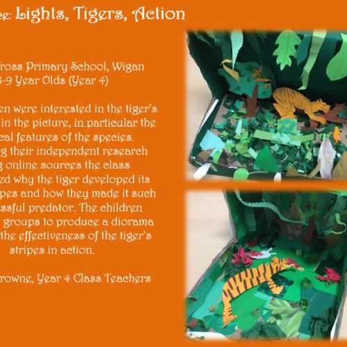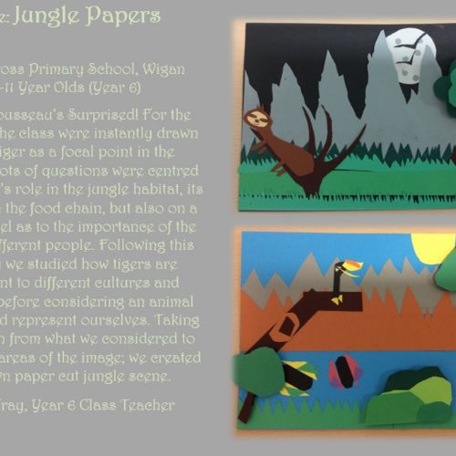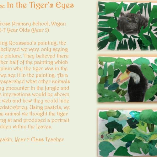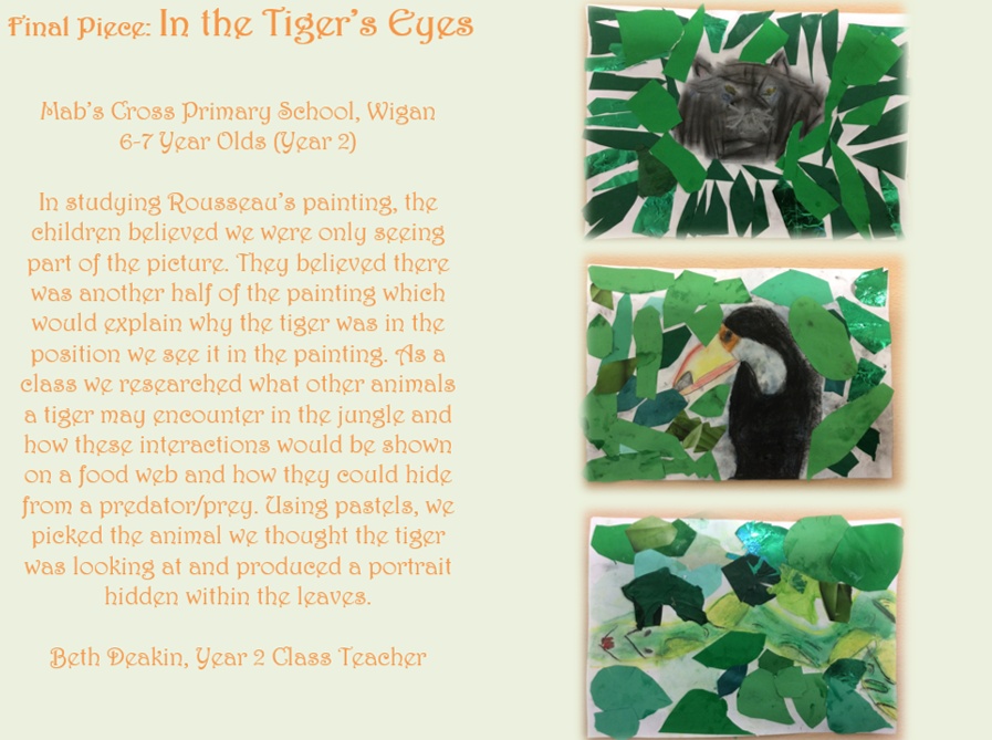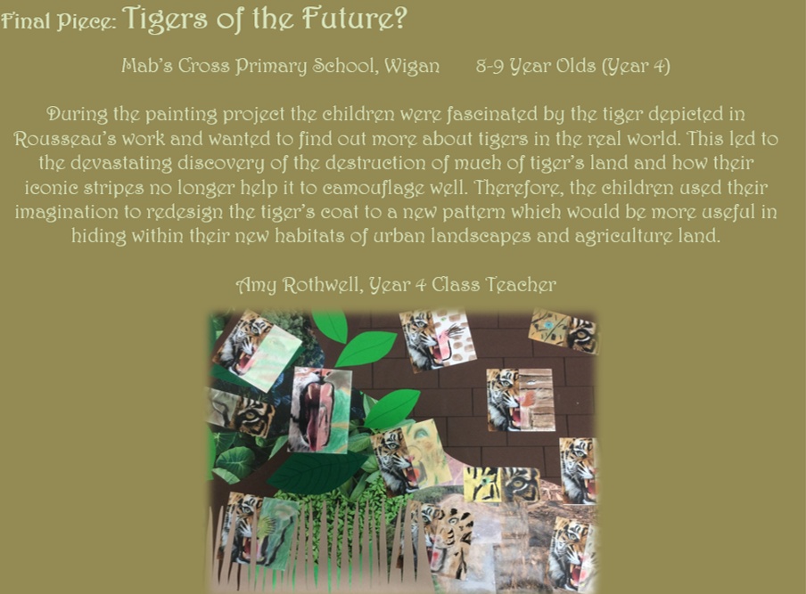 The Take One Picture project this year became a fixed aspect of our art and design curriculum. The project allows the children to take the lead in their own learning and develop their imagination and ideas. In this project, the whole school worked on creating artwork inspired by Henri Rousseau's 1891 painting 'Surprised!' As part of this project, the school elected to complete a 'Tiger Dance' fundraising event to support the conservation efforts of tigers in the wild in conjunction with Chester Zoo. Once the artwork was completed, all final pieces were exhibited in the local children's library for parents and members of the public to visit.